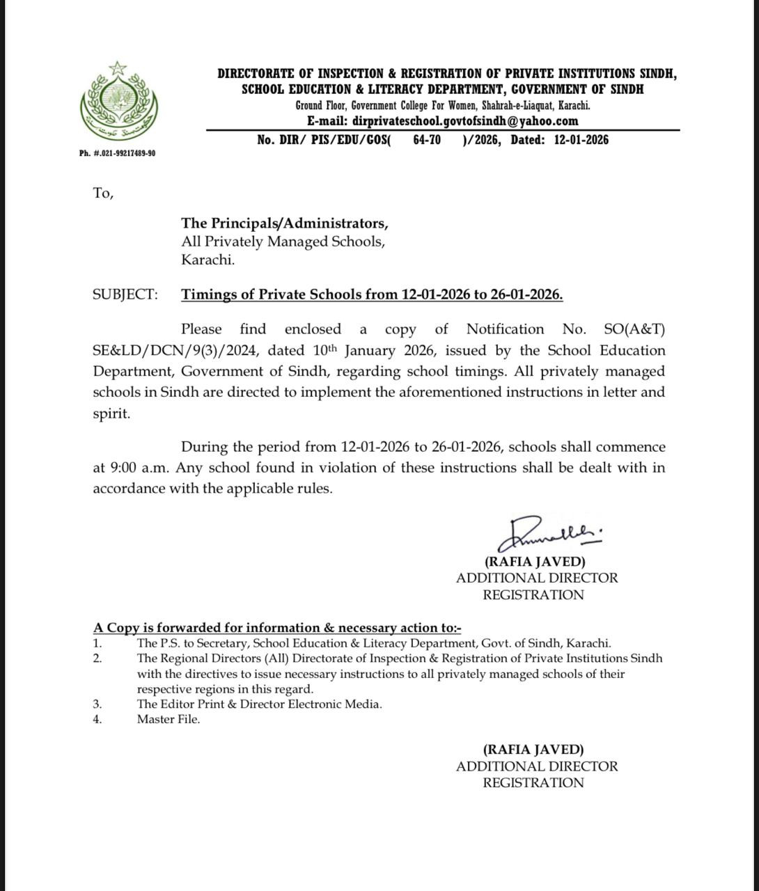 信德省私立机构理事会(Sindh Directorate of Private Institutions)向未遵守信德省政府冬季时间指令的私立学校发出严厉警告,并威胁对违规行为采取法律行动。